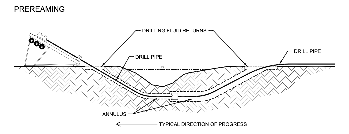 The pilot hole is progressively enlarged to the required diameter for the pipeline.