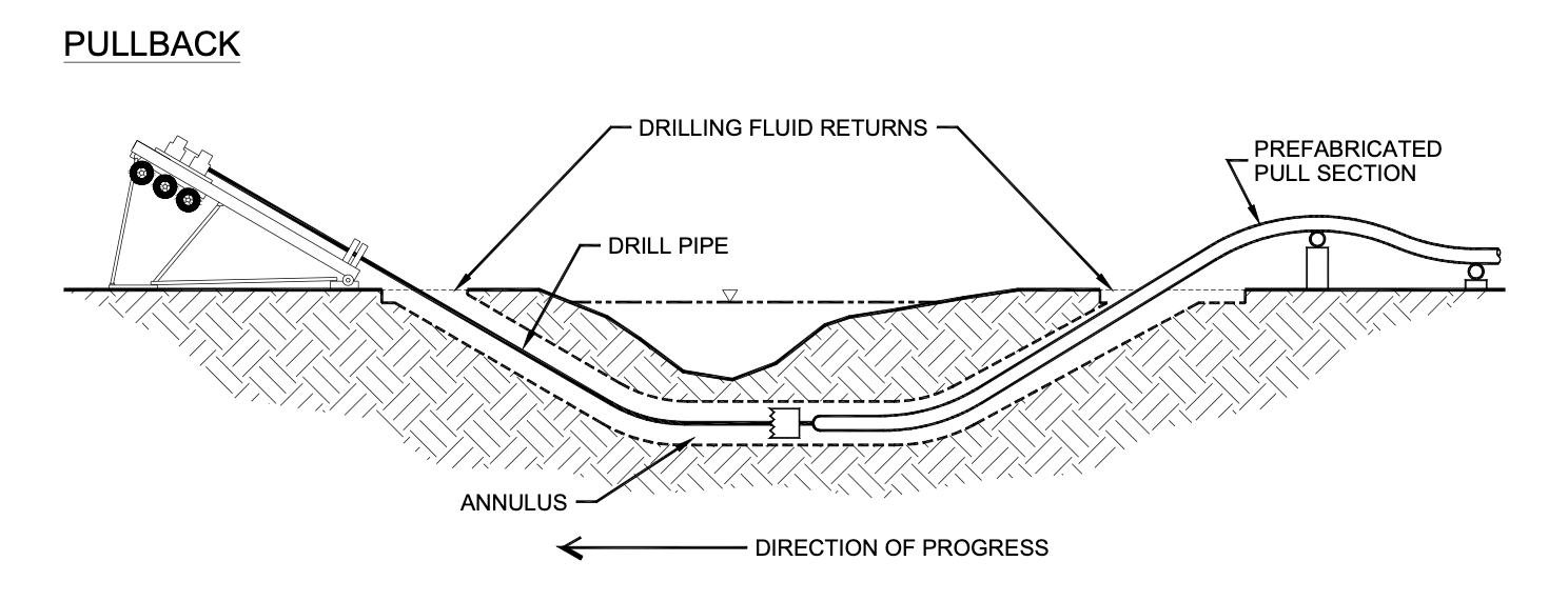 Pullback – The pipe or conduit is pulled back through the finished bore.