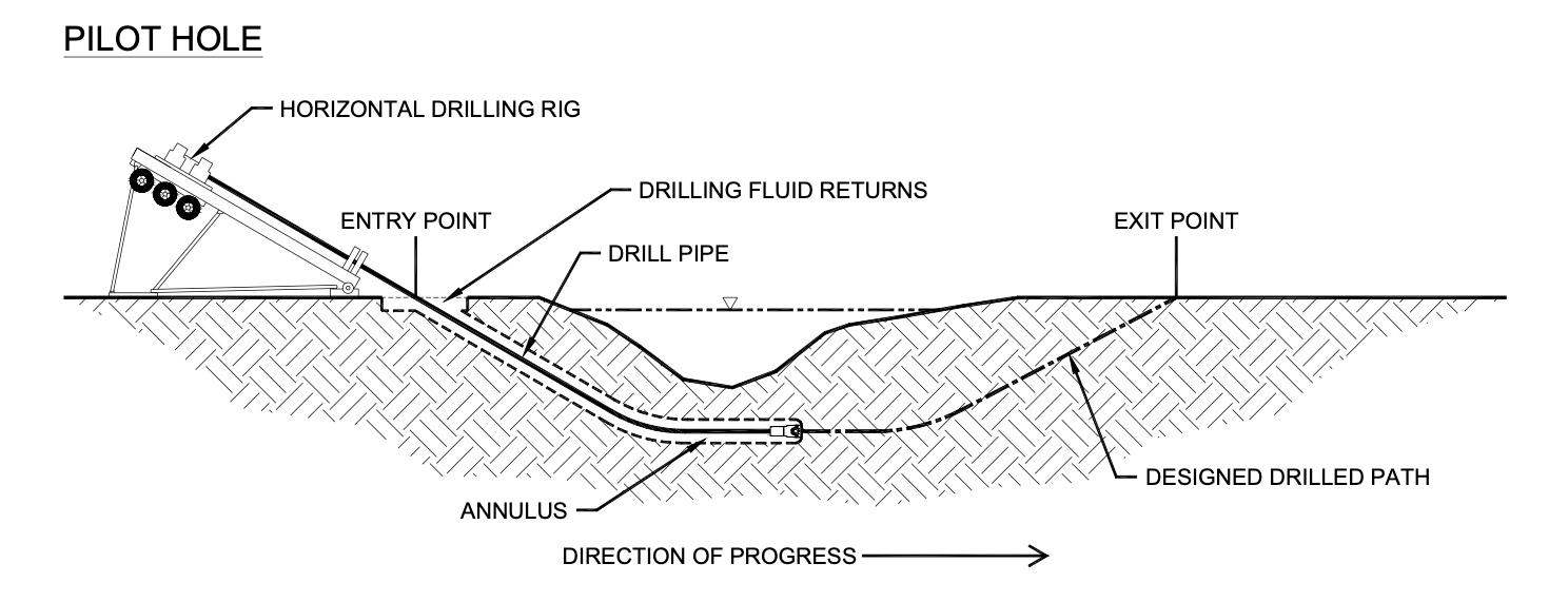 It’s called “drilling,” not boring, because it uses drilling rigs, drill pipe, steering tools, and drilling fluid—technology adapted from the oil and gas industry.